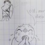 C’est alors qu’Amphinomos se réveilla et se leva. il descendit de son lit, bâilla et alla manger. Mais quand il arriva, Eurymaque, Antinoos et ses amis étaient morts. Il ne savait pas pourquoi ils étaient morts. Le sang était répandu partout sur le sol. Les plats délicieux étaient tombés par terre. C’était horrible! En ce moment, Ulysse mangeait tranquillement les fruits. Amphinomos fut en colère. Il courut vers Ulysse avec une flèche dans sa main, et BOOM! Avant qu’il arrive, Ulysse lança une fourchette dans sa tête. Amphinomos était mort. Mais soudain (…)